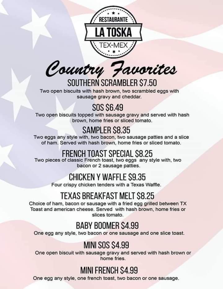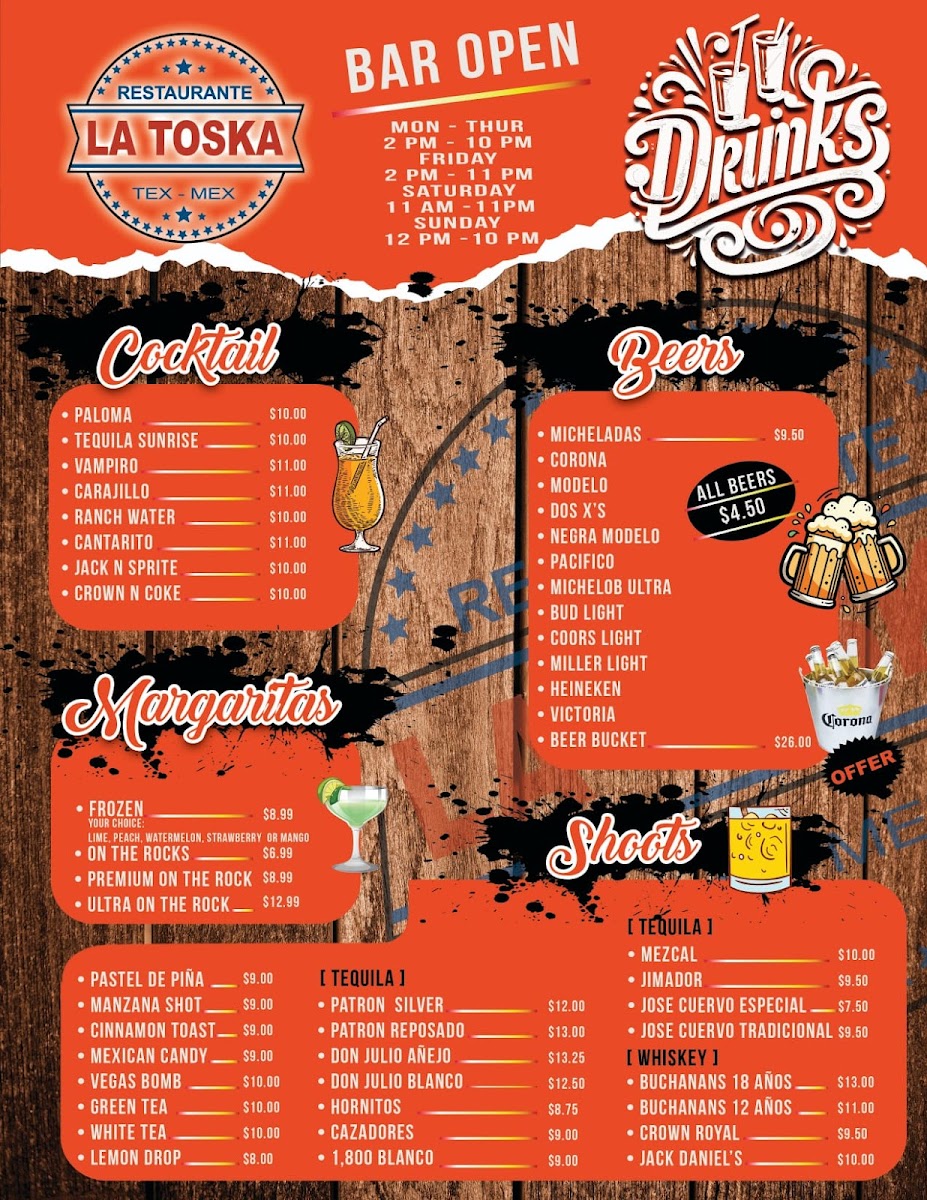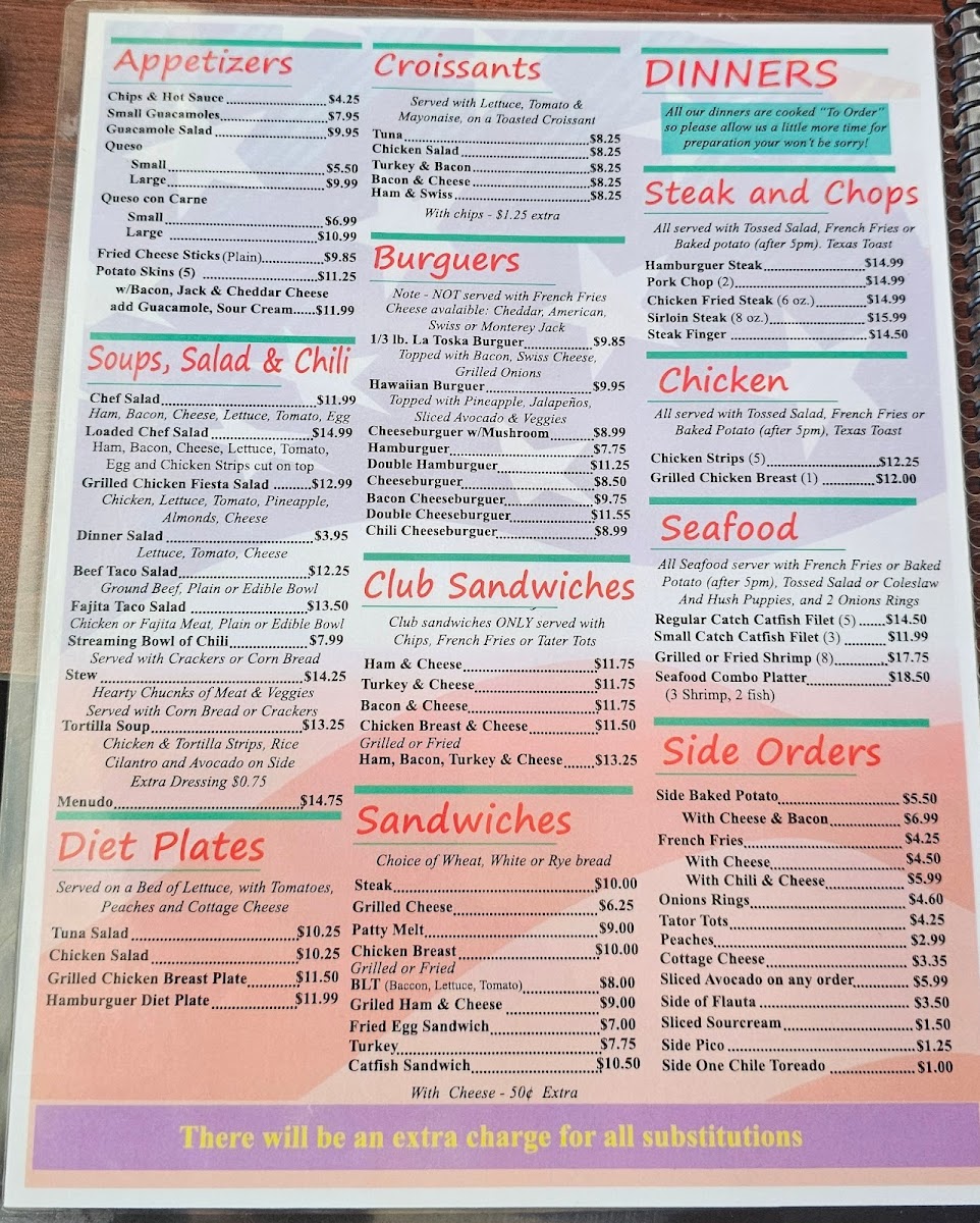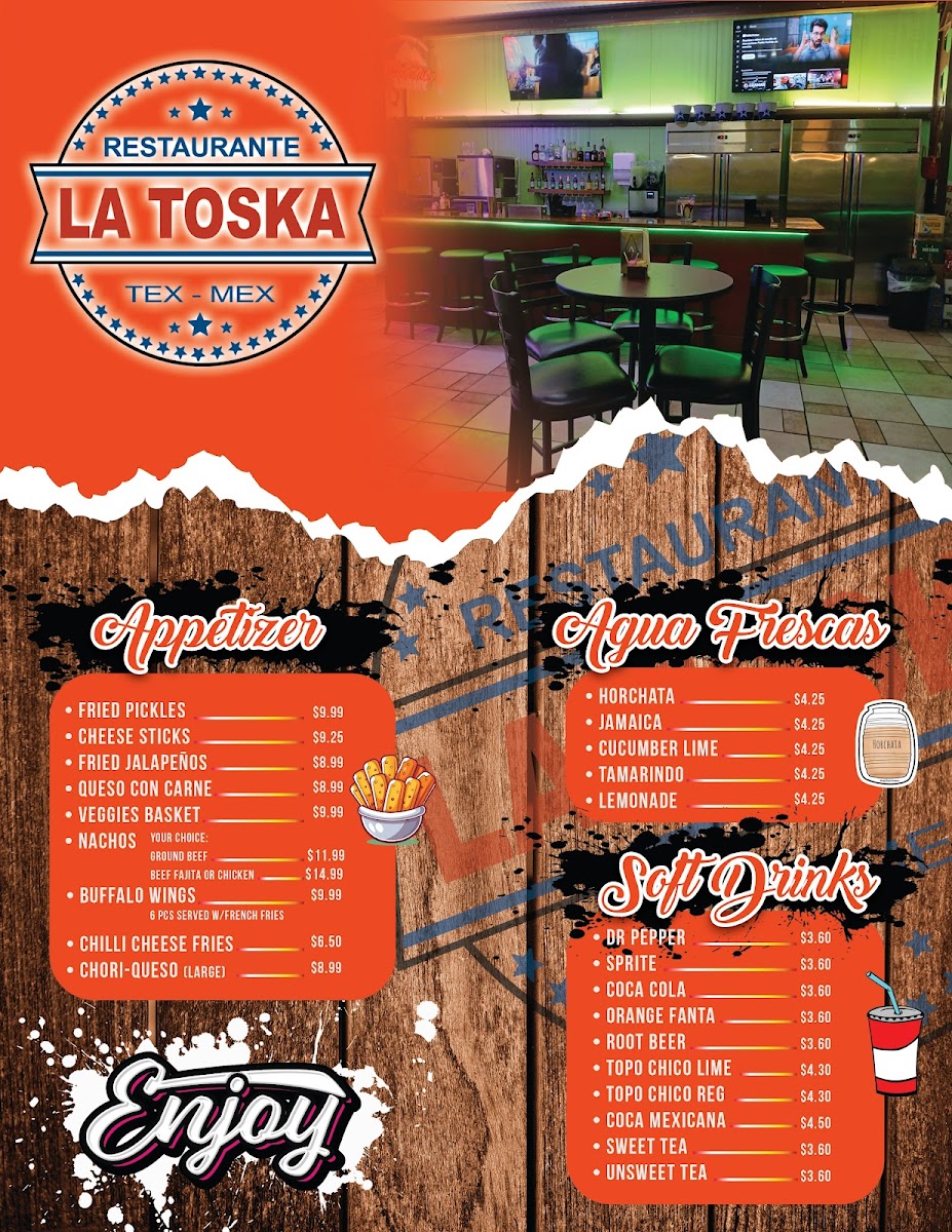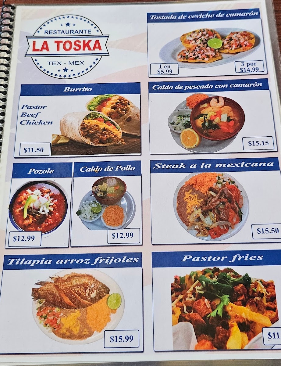 Welcome to Restaurant La Toska Tex Mex, a delightful Mexican dining experience located in Cedar Hill, TX. The menu shines with a range of Tex-Mex specialties, ensuring there’s something for everyone. Highlights include the savory Picadillo Plate, featuring seasoned ground beef accompanied by rice, beans, and tortillas at just $14.99. For chicken lovers, the Monterey Chicken is a must-try, perfectly grilled and served with savory toppings. Don’t miss the hearty Chicken Fried Steak Salad or the catfish fillet on Saturdays, ensuring your meal is complete with sides like baked potatoes and Texas toast.